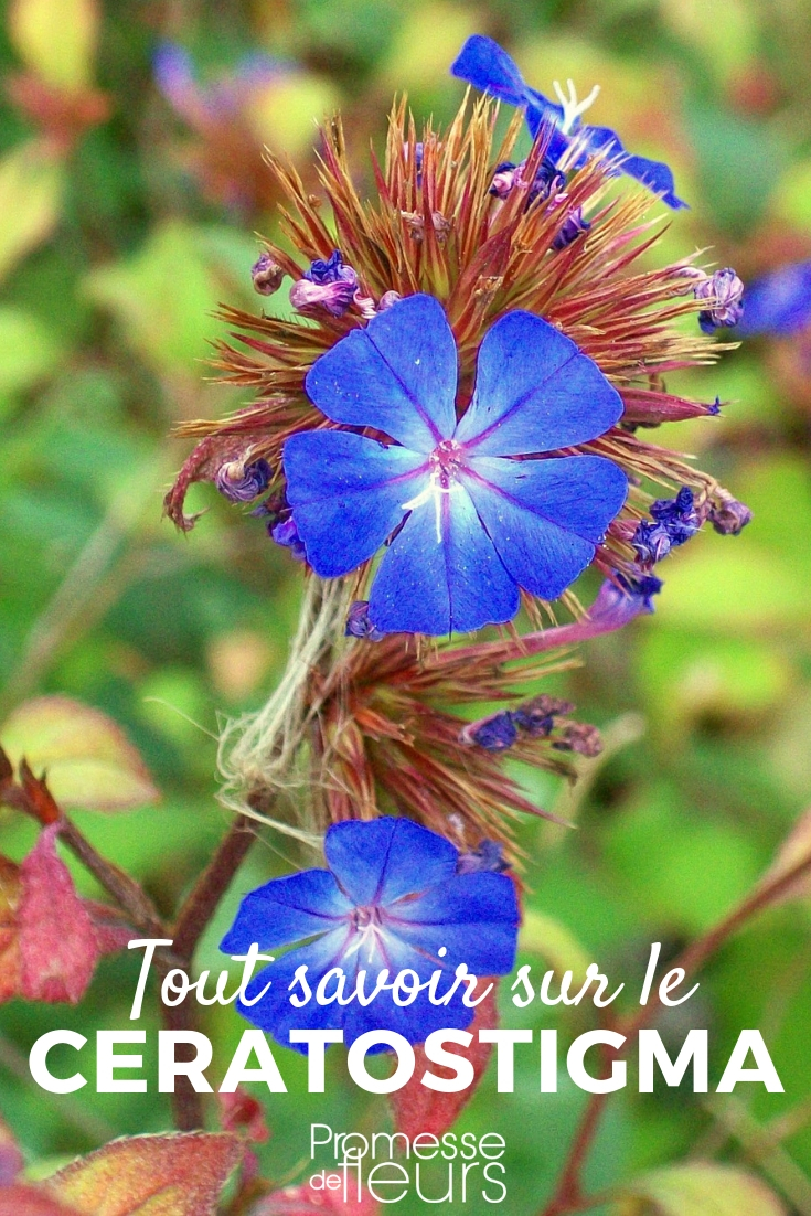 Los Ceratostigmas son plantas vivaces herbáceas o pequeños arbustos rastreros de tallos finos y densamente ramificados, pertenecientes a la familia de las Plumbagináceas, a los que antiguamente se les atribuía ese nombre. El género se compone de ocho especies, cuyo origen se sitúa en el Himalaya y en el Extremo Oriente, con una especie nativa de Somalia. A ellos se les conoce como Plumbagos de China para diferenciarlos del Plumbago del Cabo, este arbusto mucho menos resistente al frío de Sudáfrica en tonos azul pálido o blancos, que se encuentra frecuentemente en las costas del Mediterráneo. Pertenecen a la familia de las Plumbagináceas.