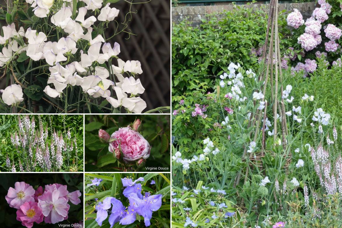 Una idea de asociación en un macizo : Lathyrus ‘Albutt Blue’, Linaria purpurea ‘Canon J. Went’, rosal ‘Lavender Dream’, rosal ‘Comte de Chambord’, Tradescantia virginiana ‘JC Weguelin’.